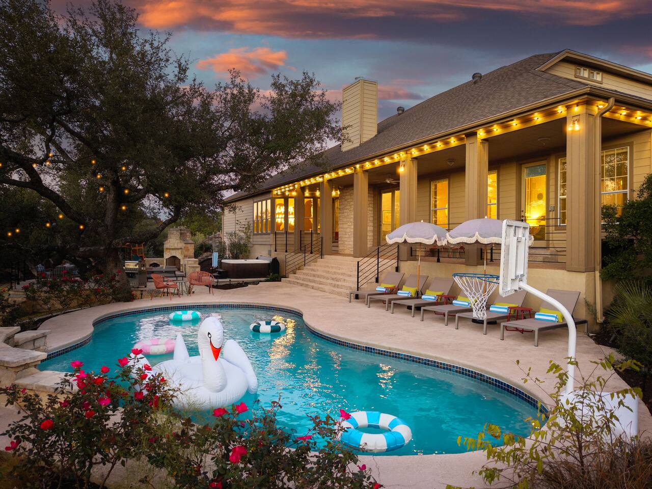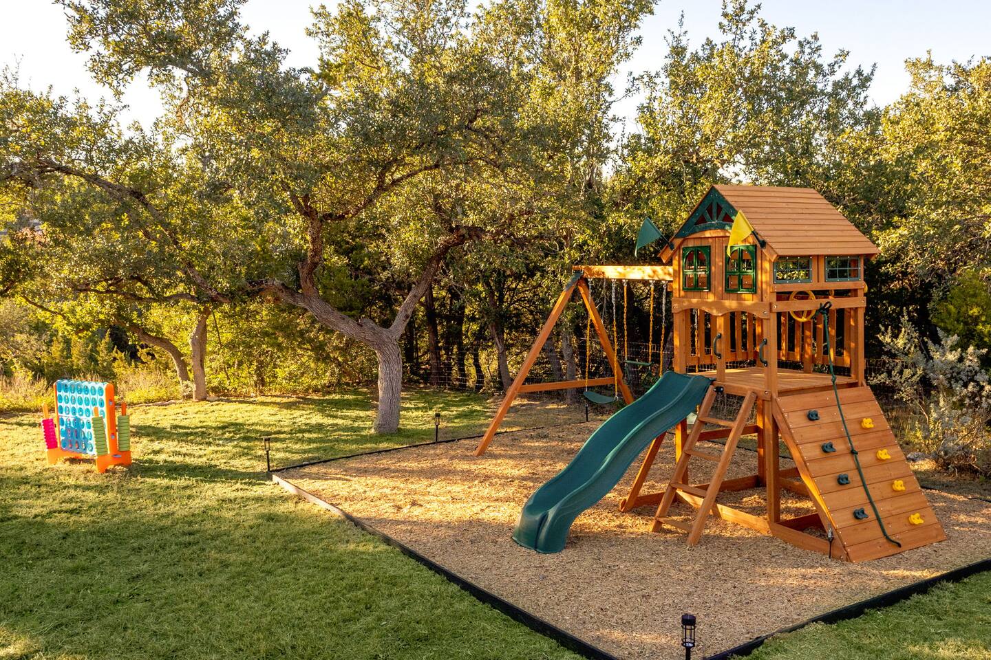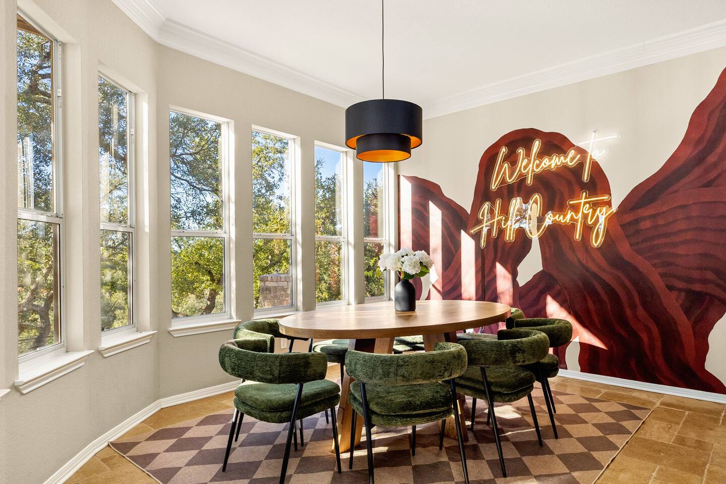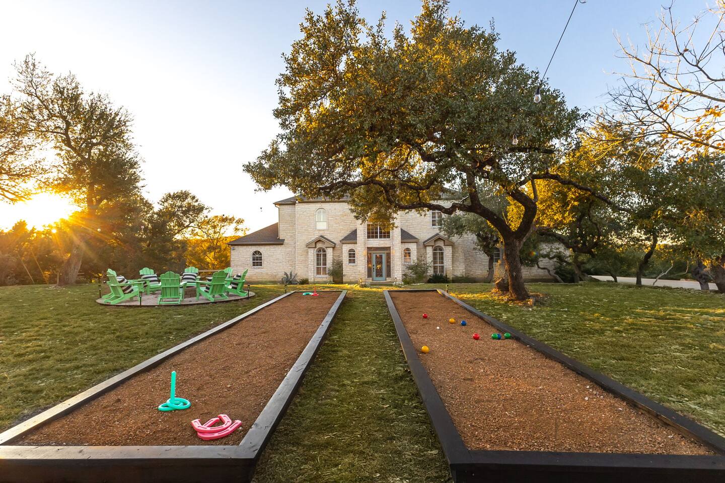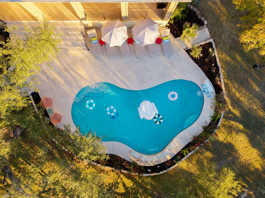 🏡 Perfect for Large Groups, Families & Multi-Generational Stays The home features multiple gathering spaces, a chef’s kitchen, large bedrooms, renovated bathrooms, high-speed WiFi, Sonos speakers, workspaces, and entertainment for all ages. Whether you're here for a wedding, a brewery weekend, or a Hill Country getaway, Moulin Rose is set up for effortless group living. 🌿 Resort-Style Outdoor Living Enjoy a private backyard designed for relaxation and fun: -Pool & hot tub -Fire pit -Outdoor dining patio with hill country view -BBQ grill -Bocce ball court + yard games -Children’s play scape -Slip and slide -Frisbee golf -Hammocks -Pool Loungers -Quiet residential setting -Pickleball court coming Spring 2026 The outdoor area is ideal for family gatherings, lounging in the sun, and unwinding after winery and venue visits. 🎮 Game Room + Entertainment Spaces The home includes multiple indoor entertainment zones for guests of all ages: -Game room with pool table -Arcade games -Poker room -Foosball -Pool table Board games for families and kids 100 inch smart projector with Sonos speakers A perfect setup for rainy days, group competitions, or evening fun. 🛏️ 6 Bedrooms — Sleeps 16 Comfortably The layout offers privacy and comfort for large families and groups: --6 thoughtfully designed bedrooms -4 newly renovated modern bathrooms -Multiple living areas for lounging Master Bedroom (Downstairs) - 1 King Bed, Trundle (2 twin beds), ensuite bathroom with shower and bathtub, Roku TV Bedroom 2 (Downstairs) - 1 King Bed, ensuite bathroom with shower/bathtub, Roku TV Bedroom 3 (Upstairs) - 2 King Beds with getting ready station, Roku TV Bedroom 4 (Upstairs) - **entrance only from bathroom, Bunk with 2 Queen beds, desk, Roku TV Bedroom 5 (Upstairs) - 1 King Bed, Jack n’ Jill bathroom with shower, Roku TV, Bedroom 6 (Upstairs) - 1 King Bed, desk, Jack n’ Jill bathroom with shower, Roku TV 💻 Work-Friendly Features Ideal for remote workers, wedding prep, or corporate teams: -High-speed internet -Multiple desks/workstations -Strong WiFi coverage throughout the home You're minutes from the area’s most popular destinations: Wedding Venues Nearby The Arlo — 11 min The Addison Grove — 11 min Prospect House — 13 min Camp Lucy — 18 min Vista West Ranch — 23 min Breweries, Wineries & Distilleries Deep Eddy Vodka — 5 min Treaty Oak Distilling — 13 min Jester King Brewery — 14 min Bell Springs Winery — 16 min Vista Brewing — 20 min Dining & Essentials Vespa Rossa - 3 min Oakwood Public Market - 5 min Flores Mexican Restaurant - 5 min H-E-B grocery — 8 min Mercer Street shops — 10 min Abby Jane Bakeshop - 13 min The home is conveniently located while remaining quiet and private.