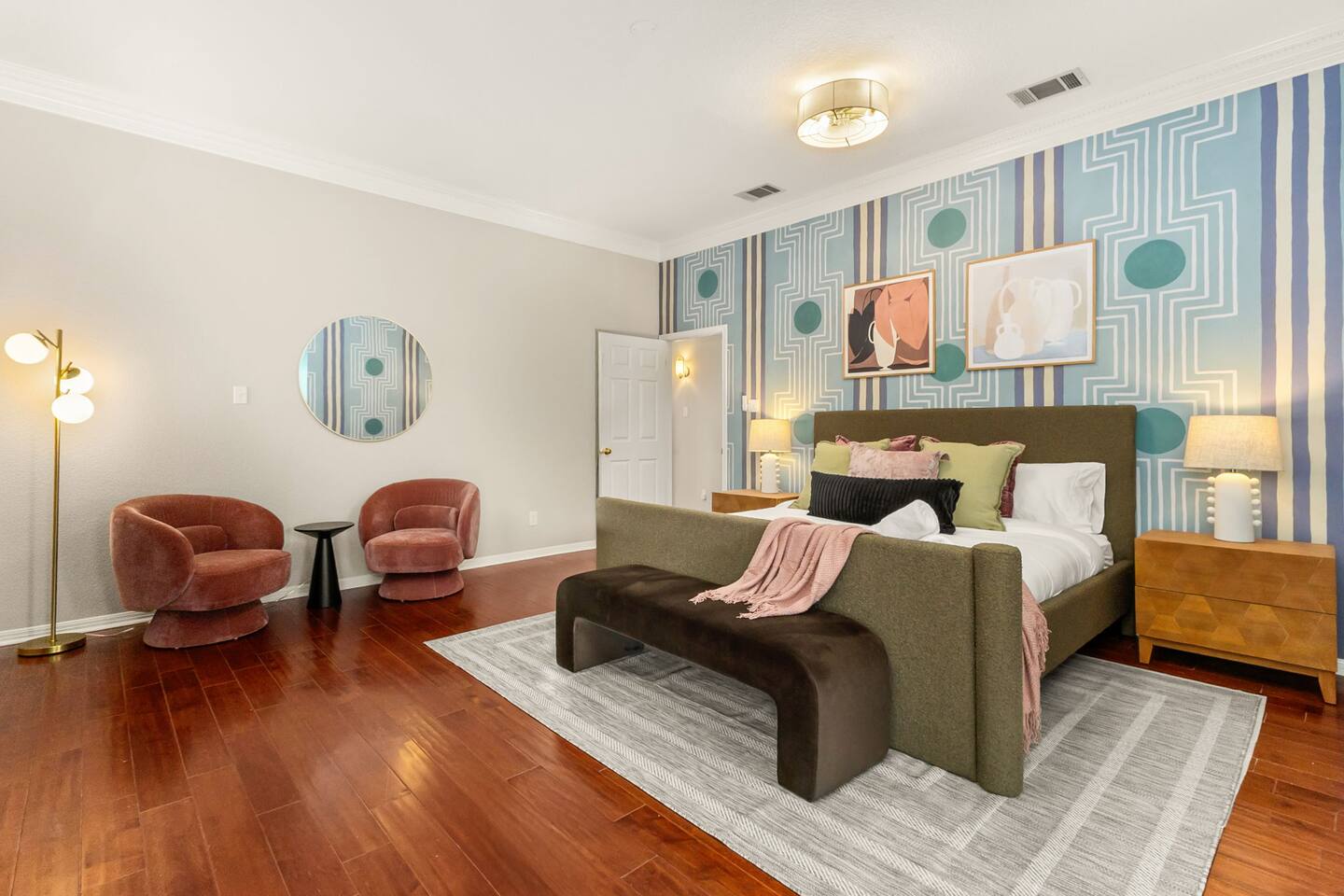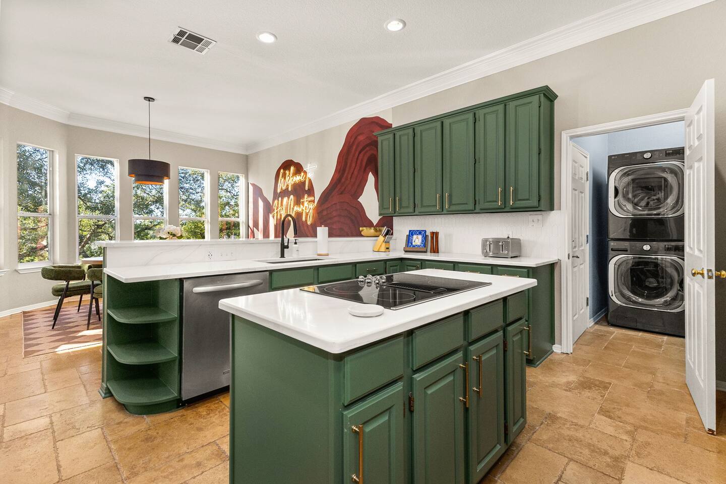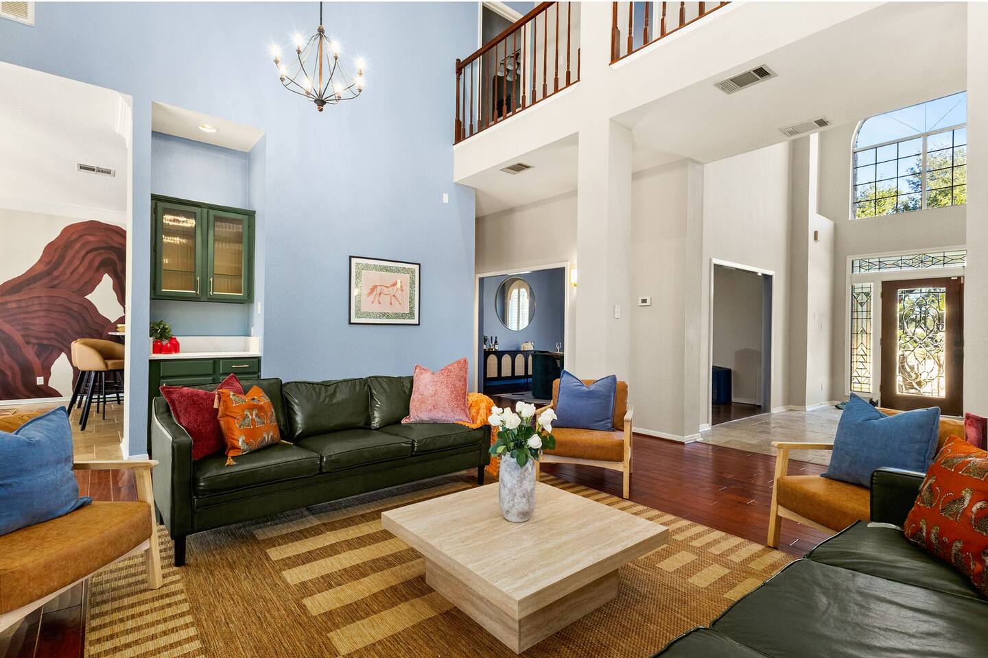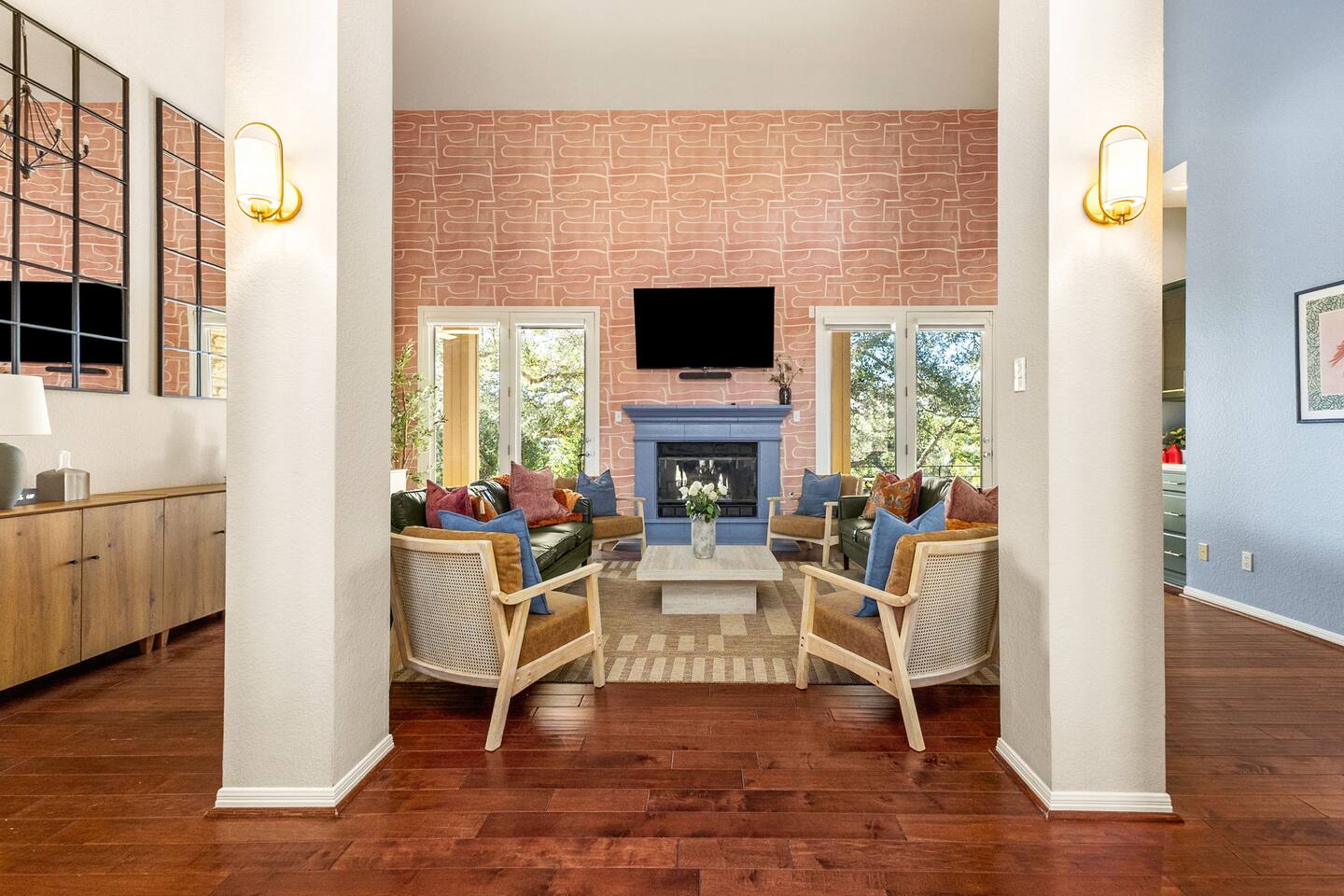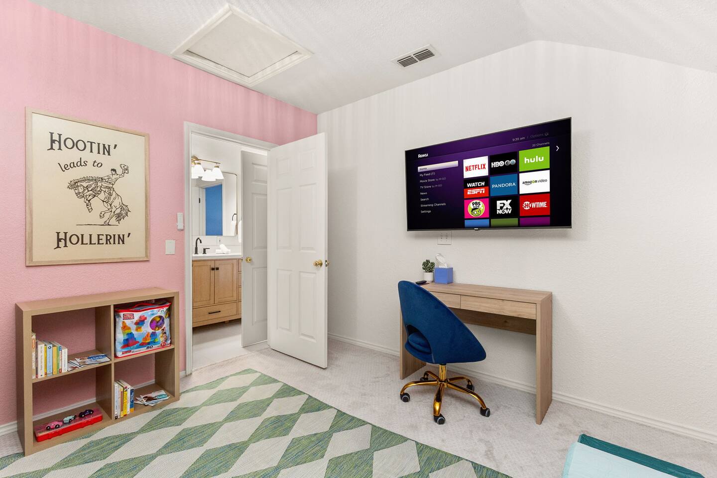 🏡 Perfect for Large Groups, Families & Multi-Generational Stays The home features multiple gathering spaces, a chef’s kitchen, large bedrooms, renovated bathrooms, high-speed WiFi, Sonos speakers, workspaces, and entertainment for all ages. Whether you're here for a wedding, a brewery weekend, or a Hill Country getaway, Moulin Rose is set up for effortless group living. 🌿 Resort-Style Outdoor Living Enjoy a private backyard designed for relaxation and fun: -Pool & hot tub -Fire pit -Outdoor dining patio with hill country view -BBQ grill -Bocce ball court + yard games -Children’s play scape -Slip and slide -Frisbee golf -Hammocks -Pool Loungers -Quiet residential setting -Pickleball court coming Spring 2026 The outdoor area is ideal for family gatherings, lounging in the sun, and unwinding after winery and venue visits. 🎮 Game Room + Entertainment Spaces The home includes multiple indoor entertainment zones for guests of all ages: -Game room with pool table -Arcade games -Poker room -Foosball -Pool table Board games for families and kids 100 inch smart projector with Sonos speakers A perfect setup for rainy days, group competitions, or evening fun. 🛏️ 6 Bedrooms — Sleeps 16 Comfortably The layout offers privacy and comfort for large families and groups: --6 thoughtfully designed bedrooms -4 newly renovated modern bathrooms -Multiple living areas for lounging Master Bedroom (Downstairs) - 1 King Bed, Trundle (2 twin beds), ensuite bathroom with shower and bathtub, Roku TV Bedroom 2 (Downstairs) - 1 King Bed, ensuite bathroom with shower/bathtub, Roku TV Bedroom 3 (Upstairs) - 2 King Beds with getting ready station, Roku TV Bedroom 4 (Upstairs) - **entrance only from bathroom, Bunk with 2 Queen beds, desk, Roku TV Bedroom 5 (Upstairs) - 1 King Bed, Jack n’ Jill bathroom with shower, Roku TV, Bedroom 6 (Upstairs) - 1 King Bed, desk, Jack n’ Jill bathroom with shower, Roku TV 💻 Work-Friendly Features Ideal for remote workers, wedding prep, or corporate teams: -High-speed internet -Multiple desks/workstations -Strong WiFi coverage throughout the home You're minutes from the area’s most popular destinations: Wedding Venues Nearby The Arlo — 11 min The Addison Grove — 11 min Prospect House — 13 min Camp Lucy — 18 min Vista West Ranch — 23 min Breweries, Wineries & Distilleries Deep Eddy Vodka — 5 min Treaty Oak Distilling — 13 min Jester King Brewery — 14 min Bell Springs Winery — 16 min Vista Brewing — 20 min Dining & Essentials Vespa Rossa - 3 min Oakwood Public Market - 5 min Flores Mexican Restaurant - 5 min H-E-B grocery — 8 min Mercer Street shops — 10 min Abby Jane Bakeshop - 13 min The home is conveniently located while remaining quiet and private.